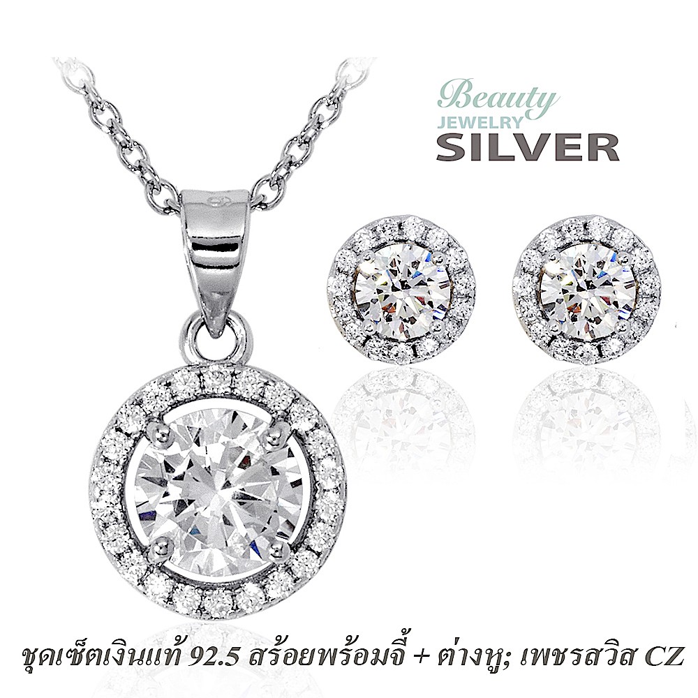 ✓ส่งทั่วไทย Beauty Jewelry ชุดเซ็ตสร้อยพร้อมจี้เพชรล้อมและต่างหูเพชรล้อม sterling silver ประดับเพชรสวิสรุ่น SS20
