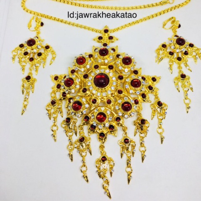 เครื่องประดับชุดไทย ชุดเจ้าสาว สร้อยคอทองพร้อมจี้สวยงามมาก งานละเอียด งานสวยเรียบหรู ประดับจิลเวอรี่และพลอยสี ใส่แล้วดูดี โดดเด่น แน่นอนจ้าาาาา ขนาดจี้ 4.5” ความยาวของเส้น23” ใส่แล้วจี้จะตกอยู่ช่วงอกค่ะ มาพร้อมต่างหูหนีบในเซ็ทเดียวกัน เครื่องประดับ เครื่องประดับชุดไทย เครื่องประดับชุดเจ้าสาว สร้อยคอทอง ต่างหูทอง ชุดไทย