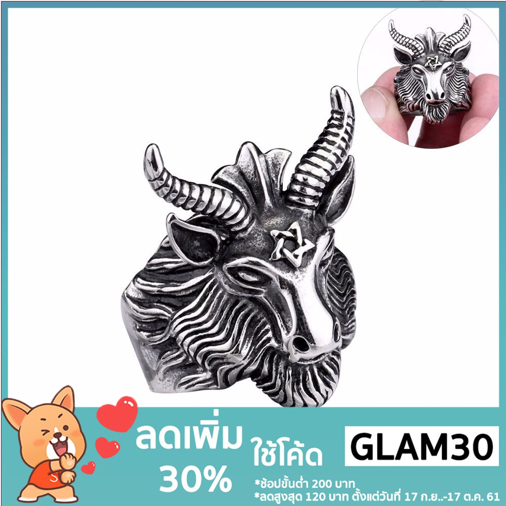 Product Details Antique Silver Jewelry Totem Carved Punk Rock Style Sheep Head Ring Pentacle Satanic Goat โค้ด GLAM3